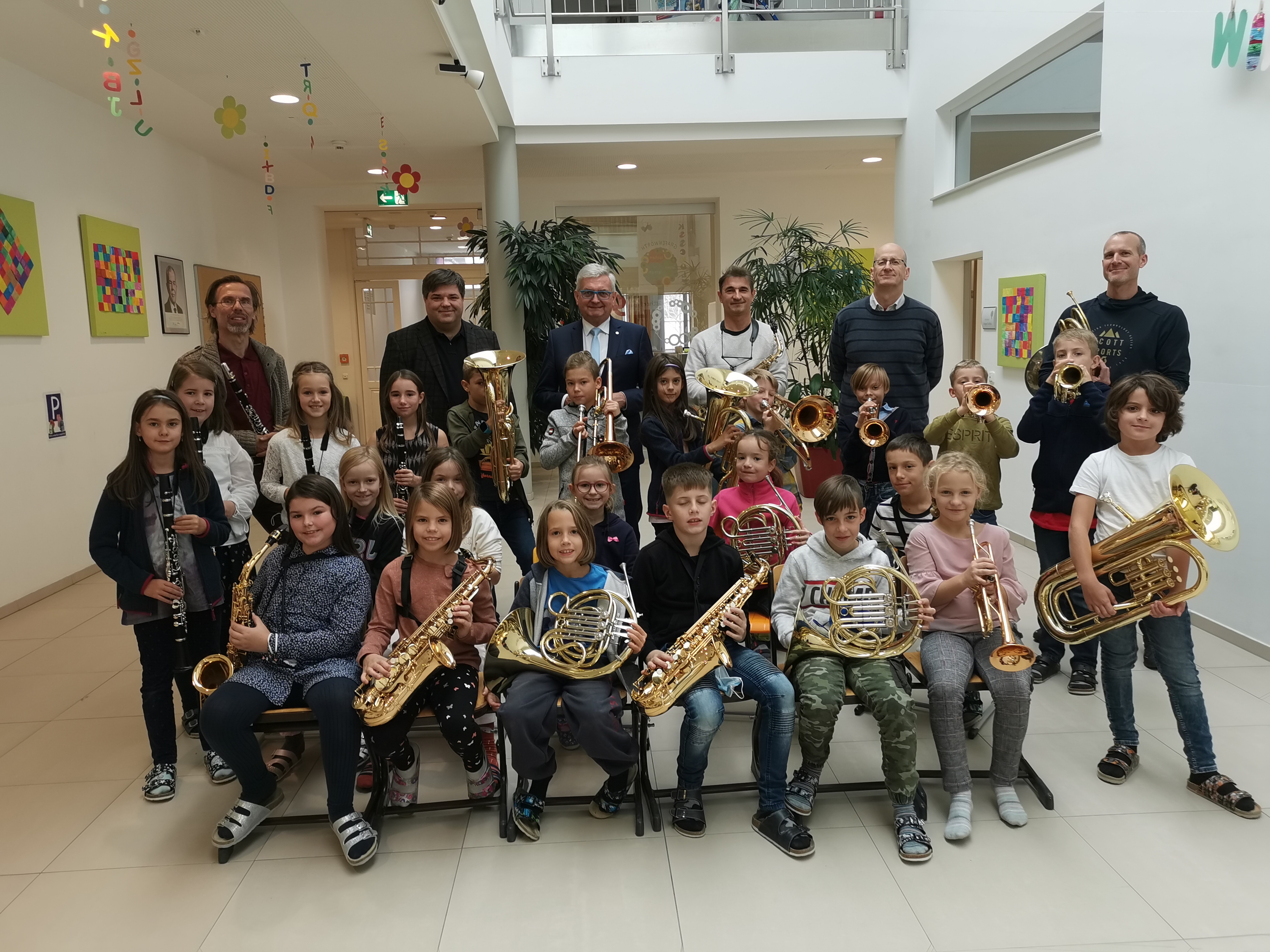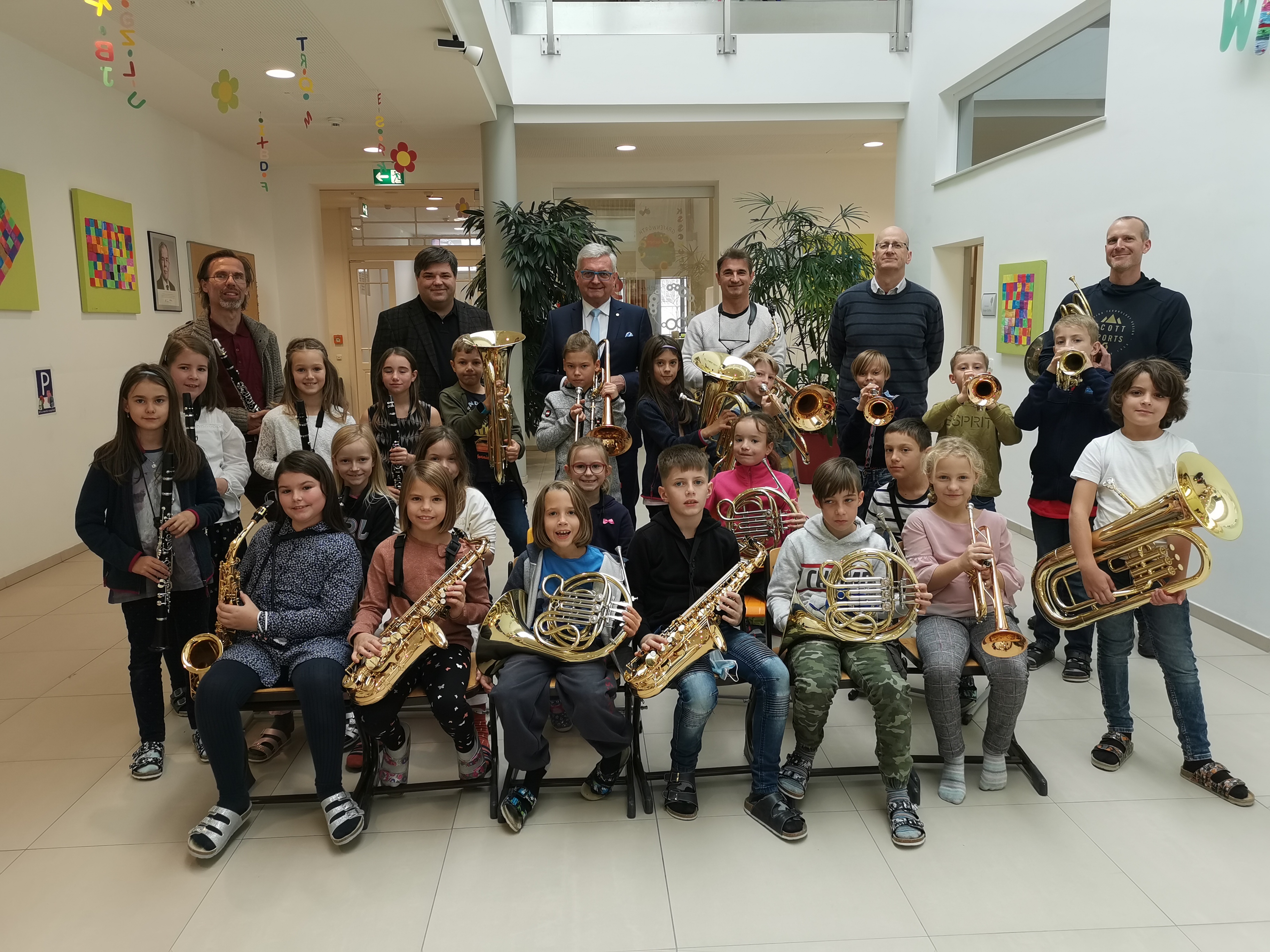 Der Ankauf der Instrumente erfolgte über die Marktgemeinde Grafenwörth. Bürgermeister und Verbandsobmann Alfred Riedl überzeugte sich vor Ort vom Fortschritt der jungen Nachwuchs-Musiker*innen. Volksschuldirektor Jürgen Duffek sowie Musikschulleiter Markus Holzer mit seinem Team sind am Foto mit den musikbegeisterten Kindern zu sehen.