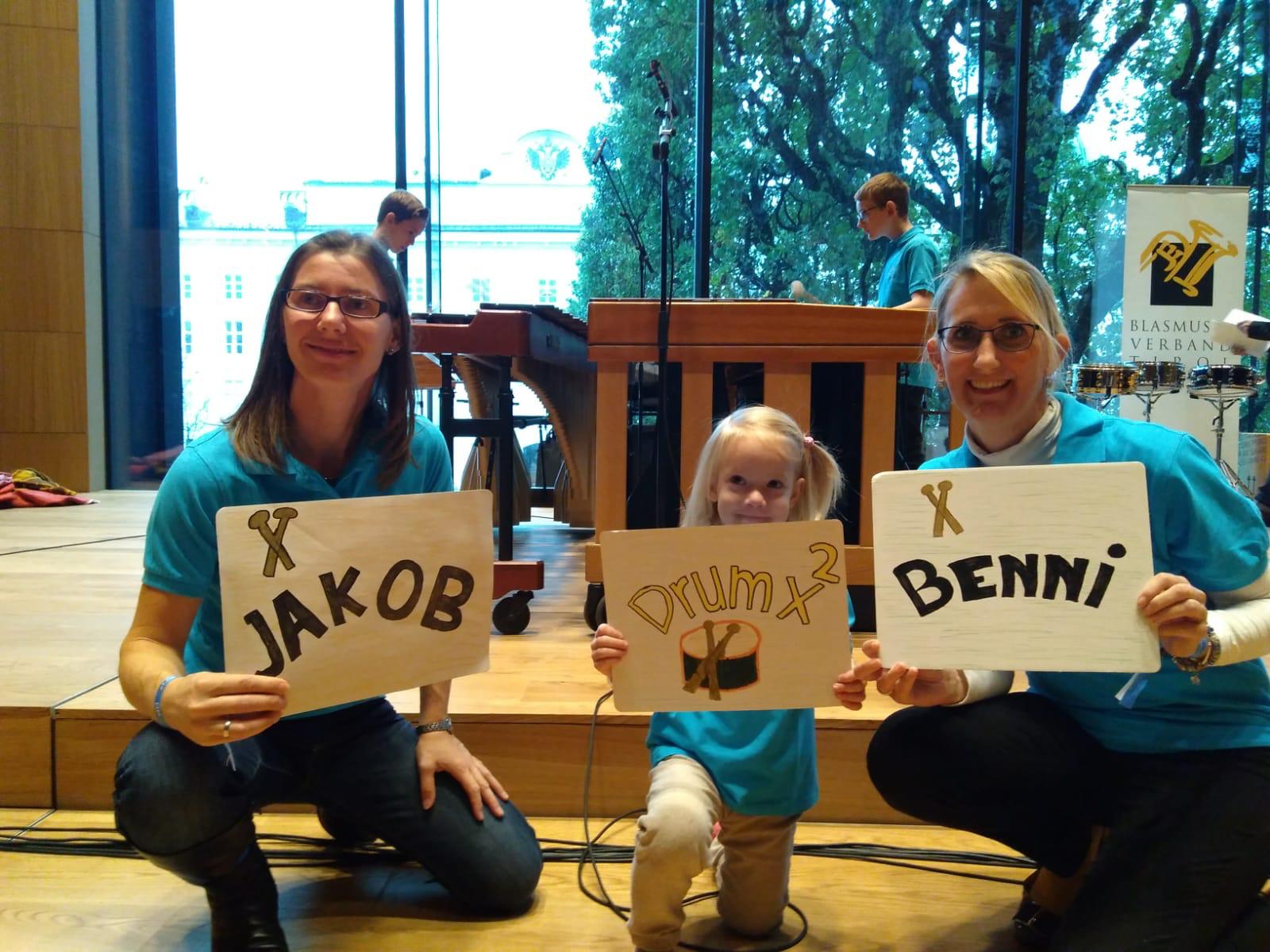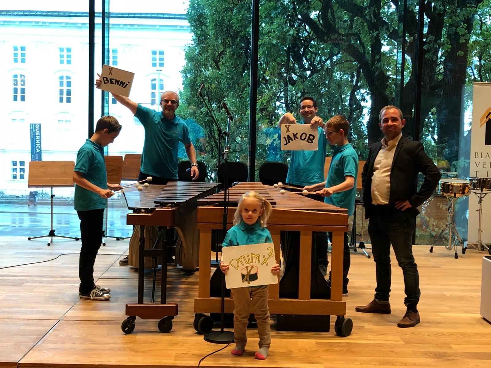 Drum x² holt sich beim Bundeswettbewerb für Musik in kleinen Gruppen den Gruppensieg im Schlagwerkensemble. Als Unterstützung mit dabei Schlagwerklehrer Peter Vorhauer und die gesamte Familie von Drum x².